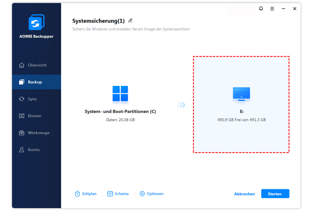 Öffnen Sie diese PC Backup-Software. Klicken Sie auf „Backup“ und dann auf „Systemsicherung“.