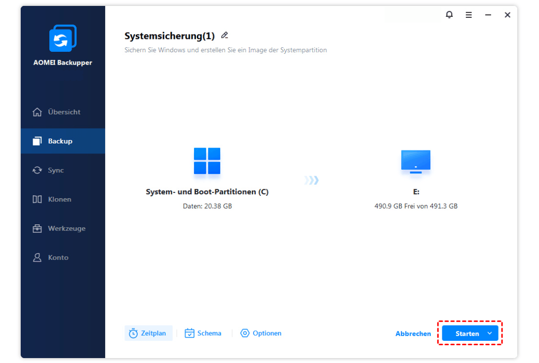Konfigurieren Sie die Sicherungsaufgabe bei Bedarf über Schema oder Zeitplan und klicken Sie dann auf „Starten“