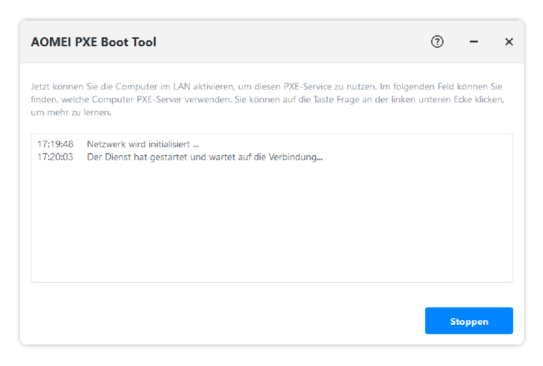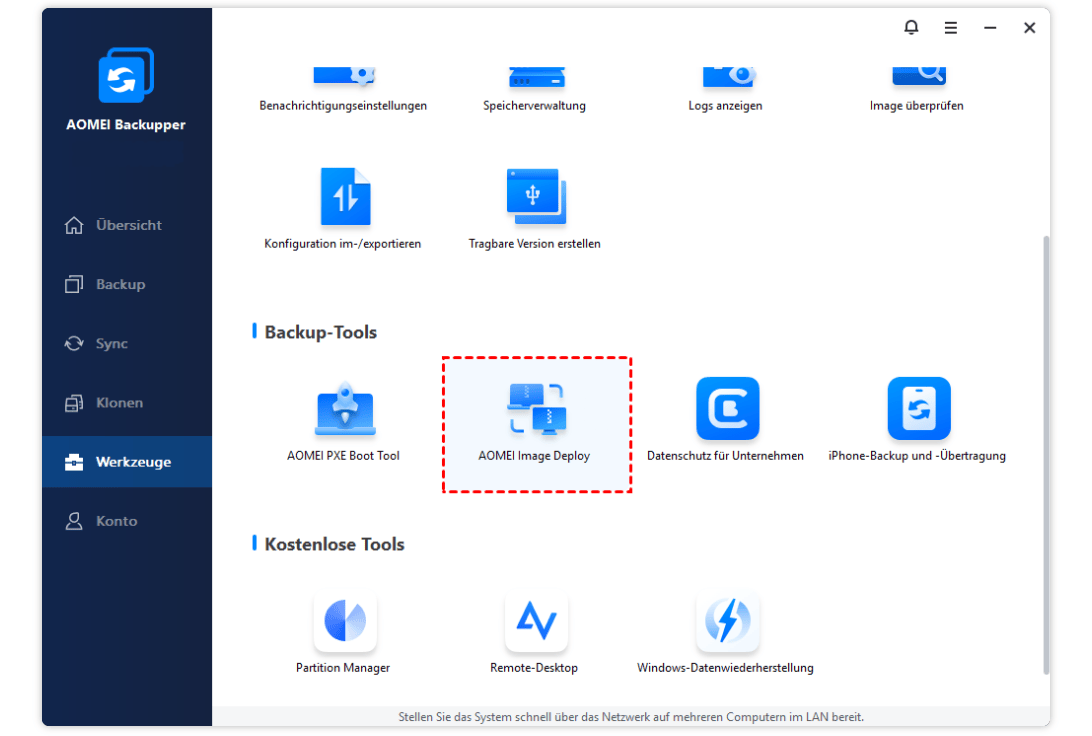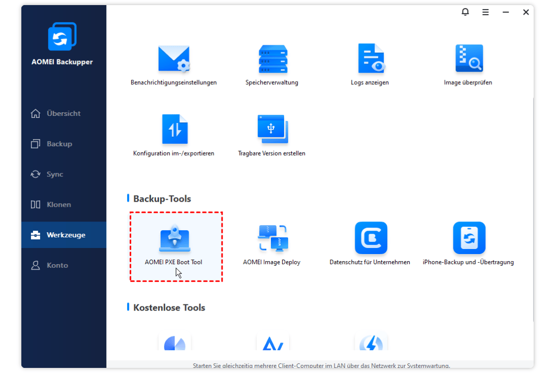 Öffnen Sie diese Computer Backup Software. Klicken Sie auf „Werkzeuge“ -> „AOMEI PXE Boot Tool“ und folgen Sie dem Assistenten.