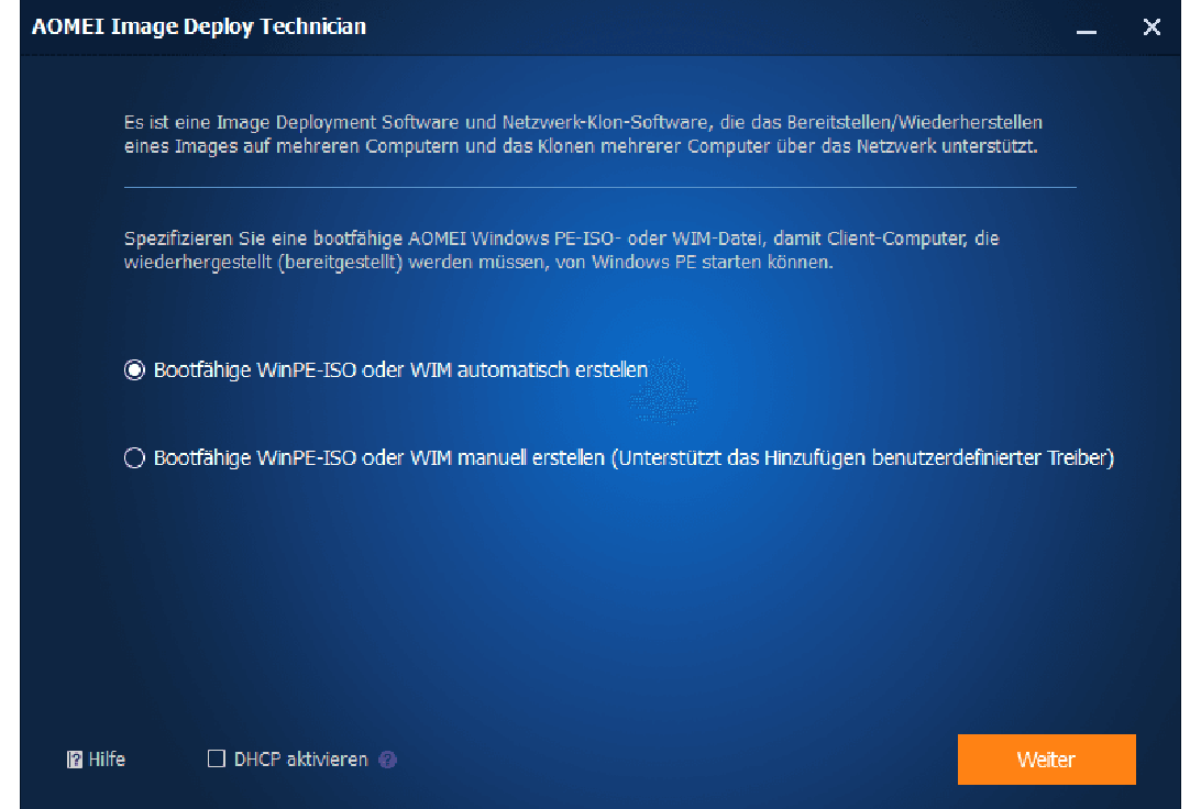 Klicken Sie auf „Werkzeuge“ -> „AOMEI Image Deploy“. Erstellen Sie dann eine ISO-Datei oder wählen Sie sie aus.