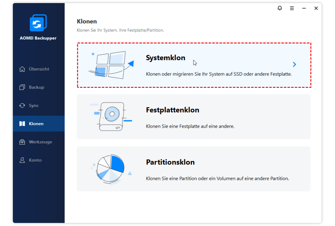 Klicken Sie in der linken Spalte auf „Klonen“ und wählen Sie dann „Systemklon“.