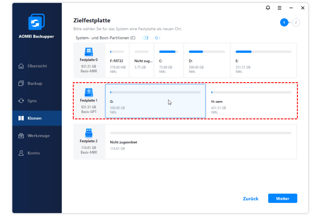 Wählen Sie das angeschlossene Laufwerk oder die SSD als Zielspeicherort für das Klonen Ihres Systemlaufwerks.