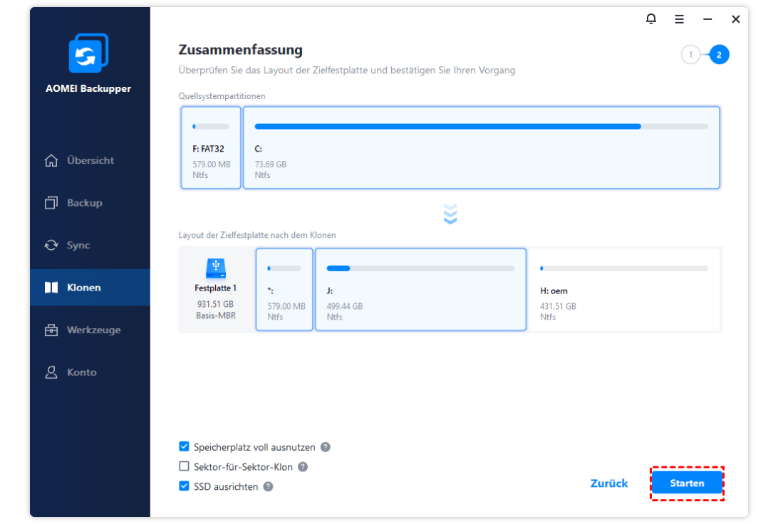Bestätigen Sie die Festplatteninformationen und klicken Sie auf „Starten“, um das System auf SSD oder HDD zu klonen.