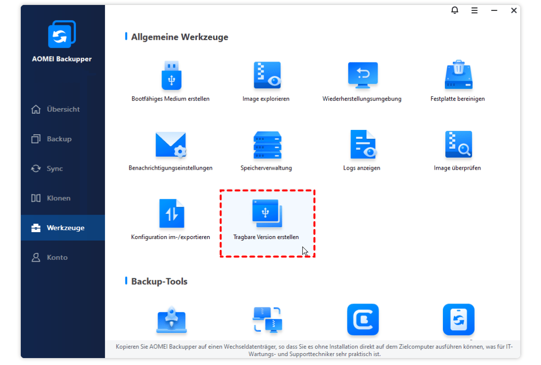 Klicken Sie auf der linken Registerkarte auf „Werkzeuge“ und wählen Sie dann das Tool „Tragbare Version erstellen“ unter dem Abschnitt „Allgemeine Werkzeuge“.